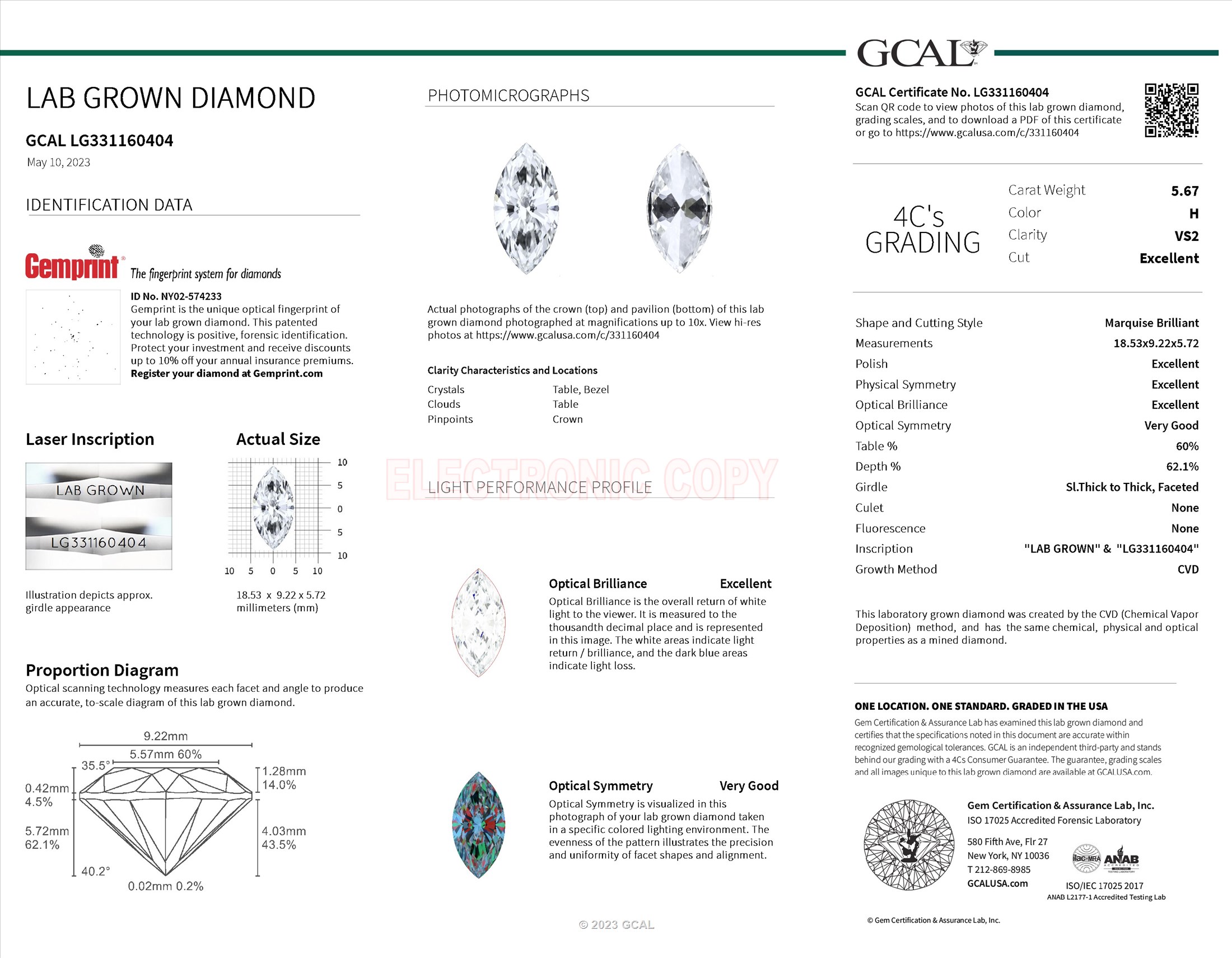 Marquise Brilliant 5.67ct, H, VS2, Excellent