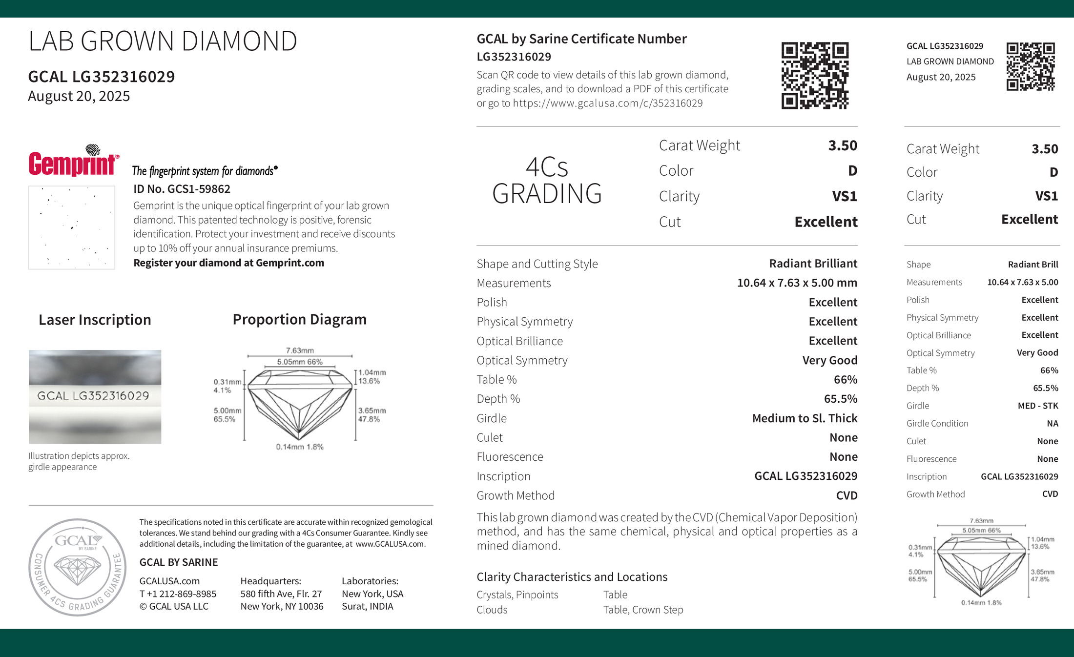 Radiant Brilliant 3.50ct, D, VS1, Excellent
