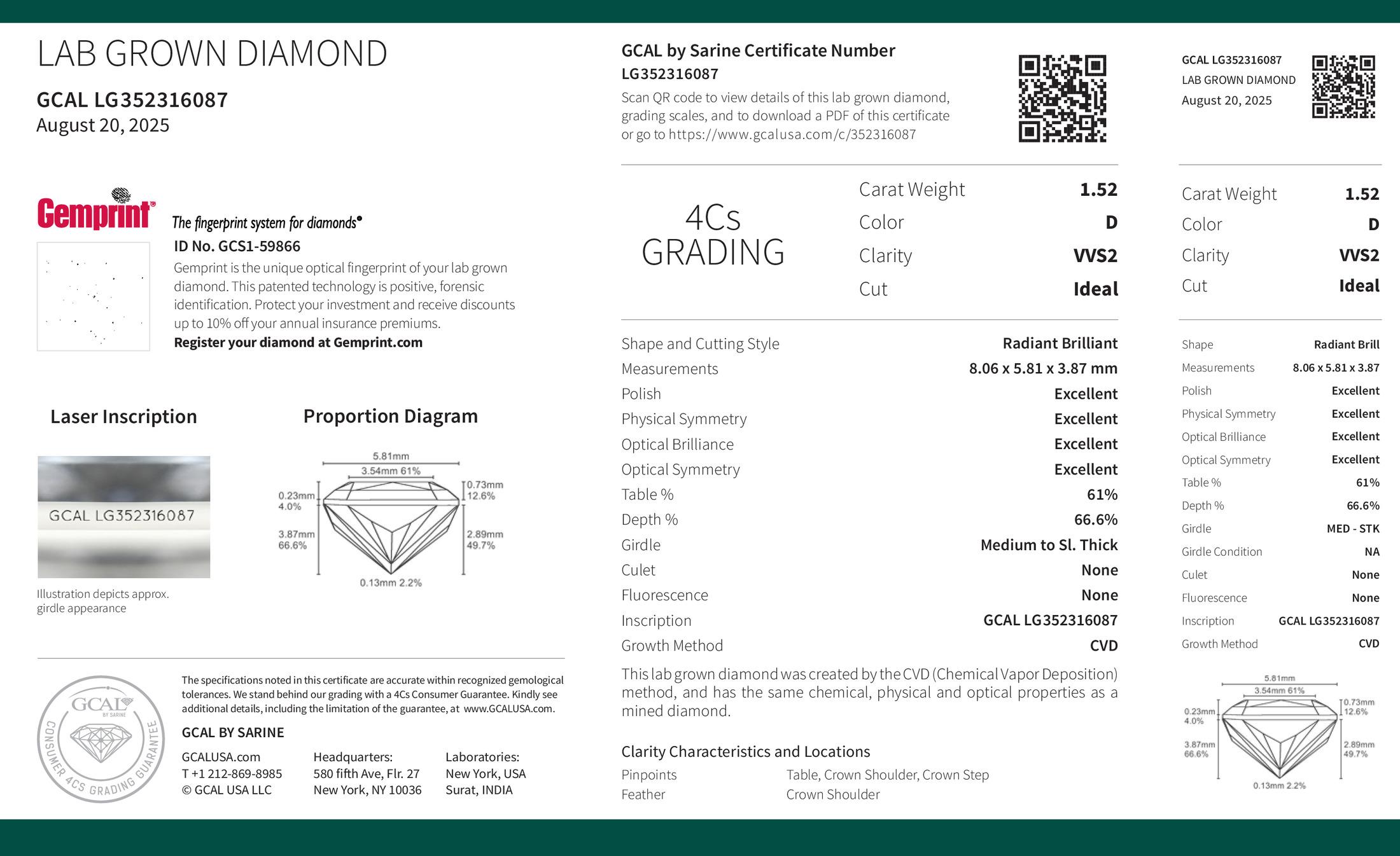 Radiant Brilliant 1.52ct, D, VVS2, Ideal